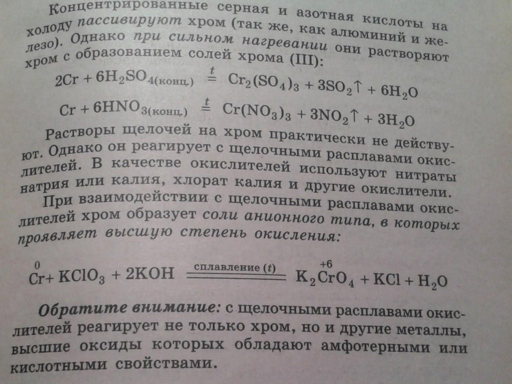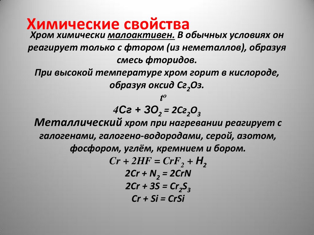 Химические свойстваХром химически малоактивен. В обычных условиях он