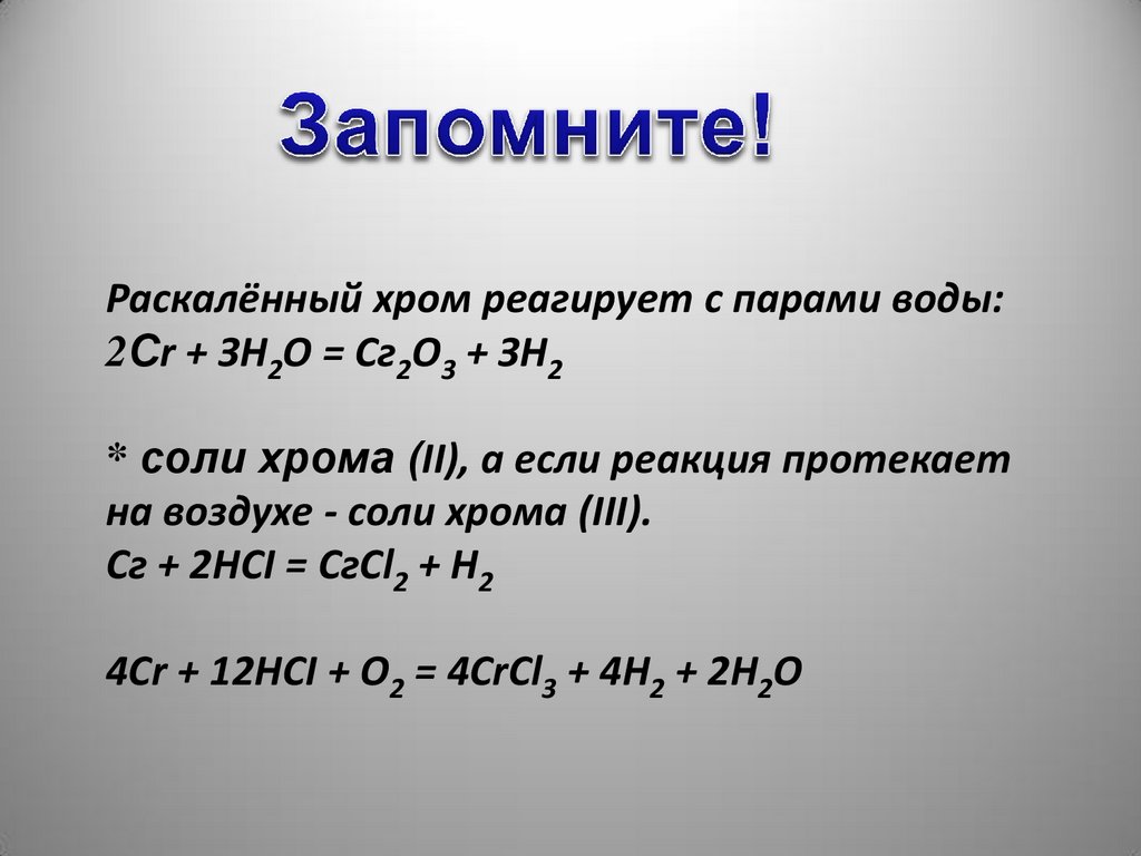 Раскалённый хром реагирует с парами воды:2Сr + ЗН2О = Сг2О3 + ЗН2
