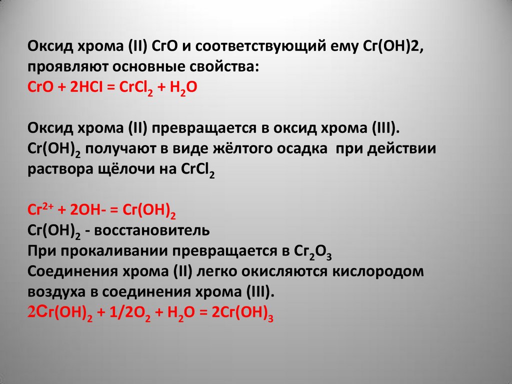 Оксид хрома (II) СгО и соответствующий ему Сг(ОН)2,проявляют основные свойства: