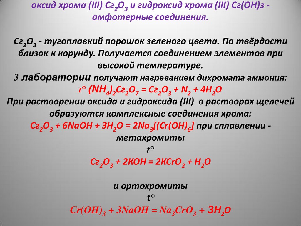 оксид хрома (III) Сг2О3 и гидроксид хрома (III) Сг(ОН)з амфотерные соединения.Сг2О3 - тугоплавкий порошок зеленого цвета. По твёрдости