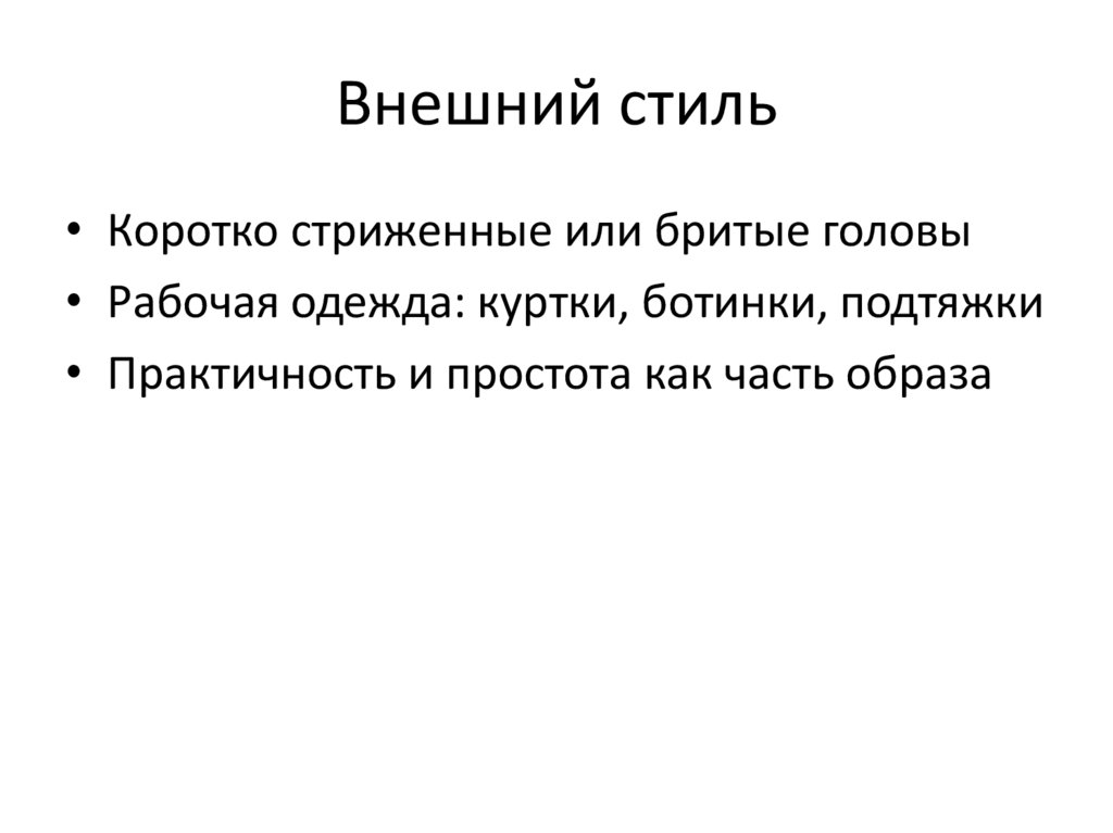 Внешний стиль• Коротко стриженные или бритые головы