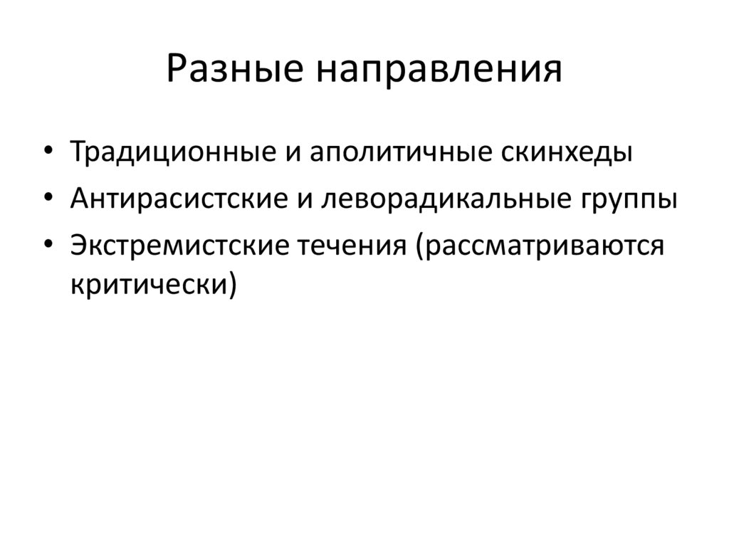 Разные направления• Традиционные и аполитичные скинхеды