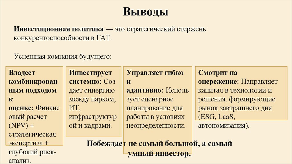 ВыводыИнвестиционная политика — это стратегический стержень