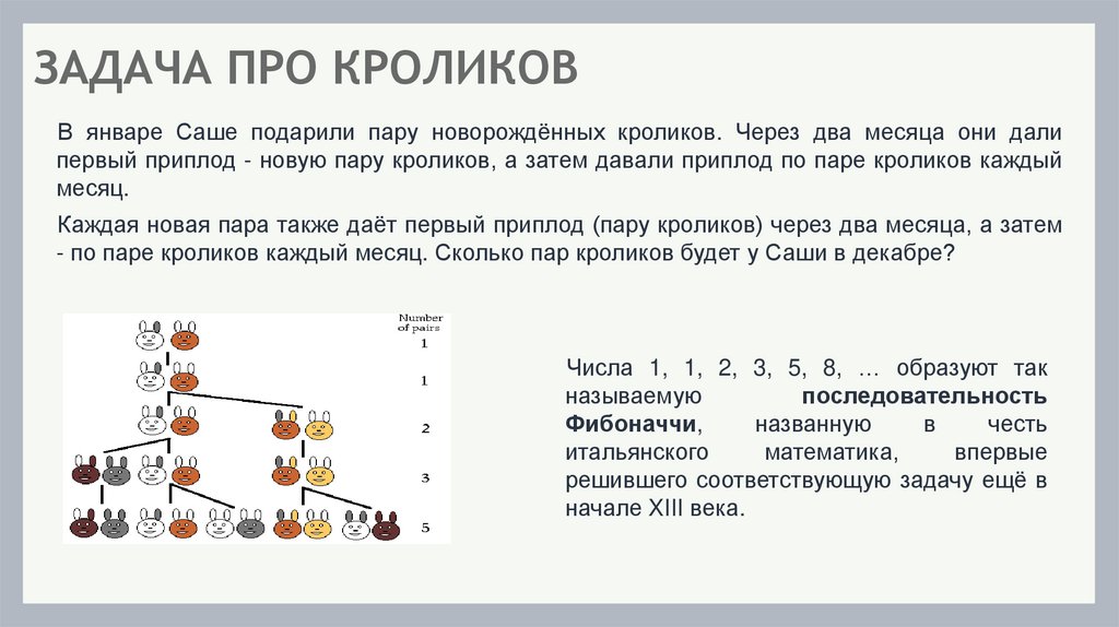 - по паре кроликов каждый месяц. Сколько пар кроликов будет у Саши в декабре?