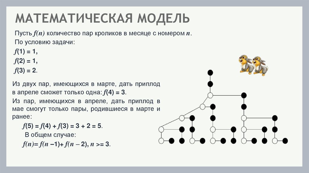 МАТЕМАТИЧЕСКАЯ МОДЕЛЬПусть f(n) количество пар кроликов в месяце с номером n.