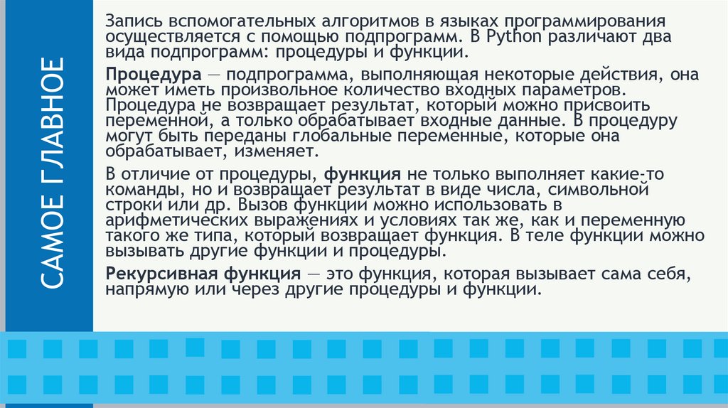 САМОЕ ГЛАВНОЕЗапись вспомогательных алгоритмов в языках программирования