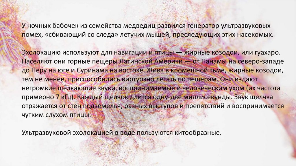 У ночных бабочек из семейства медведиц развился генератор ультразвуковыхпомех, «сбивающий со следа» летучих мышей, преследующих этих насекомых.