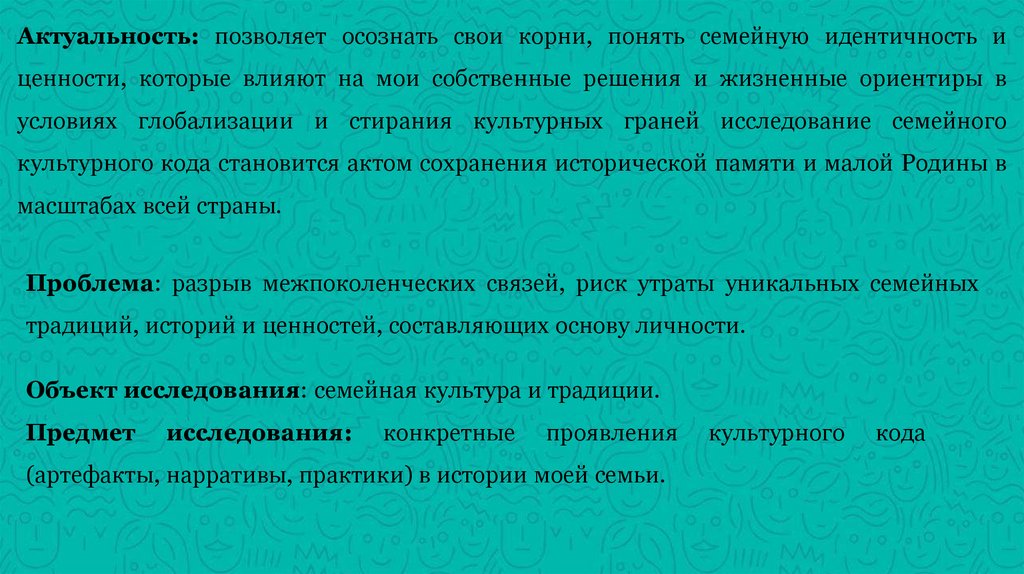 Актуальность: позволяет осознать свои корни, понять семейную идентичность иценности, которые влияют на мои собственные решения и жизненные ориентиры в