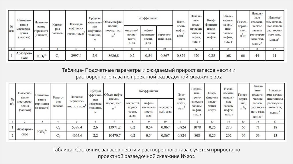 Таблица- Подсчетные параметры и ожидаемый прирост запасов нефти ирастворенного газа по проектной разведочной скважине 202