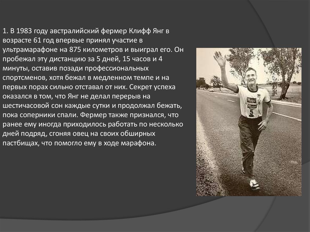 1. В 1983 году австралийский фермер Клифф Янг ввозрасте 61 год впервые принял участие в