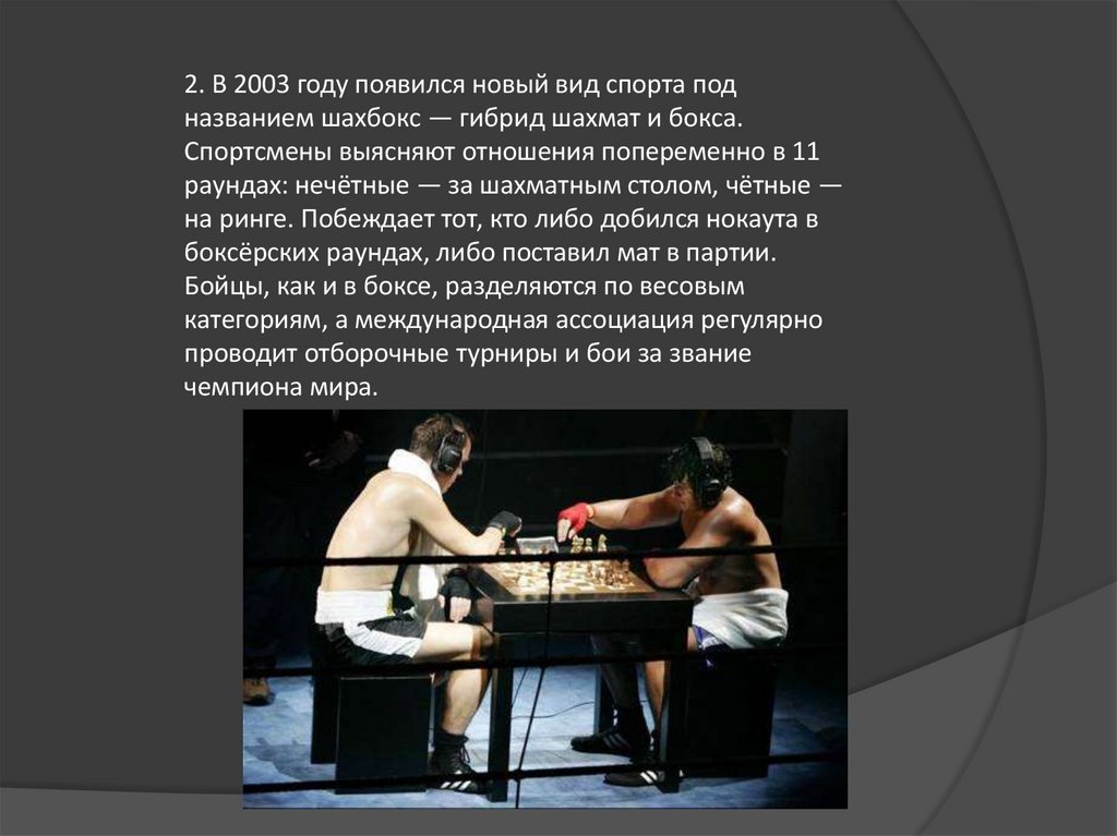 2. В 2003 году появился новый вид спорта подназванием шахбокс — гибрид шахмат и бокса.