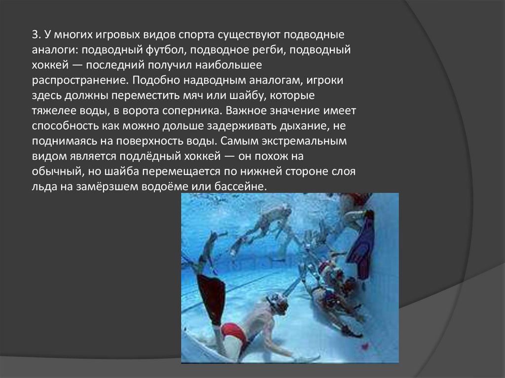 3. У многих игровых видов спорта существуют подводныеаналоги: подводный футбол, подводное регби, подводный