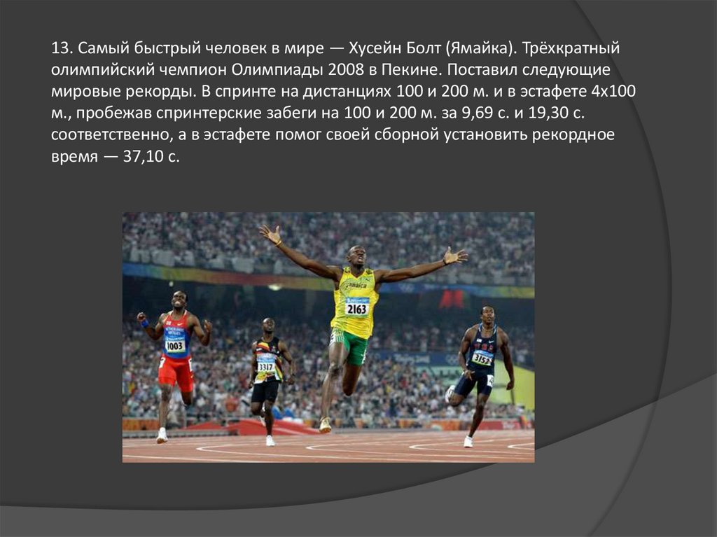 13. Самый быстрый человек в мире — Хусейн Болт (Ямайка). Трёхкратныйолимпийский чемпион Олимпиады 2008 в Пекине. Поставил следующие