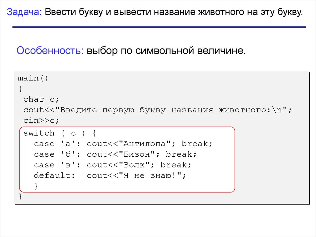 Задача: Ввести букву и вывести название животного на эту букву.Особенность: выбор по символьной величине.