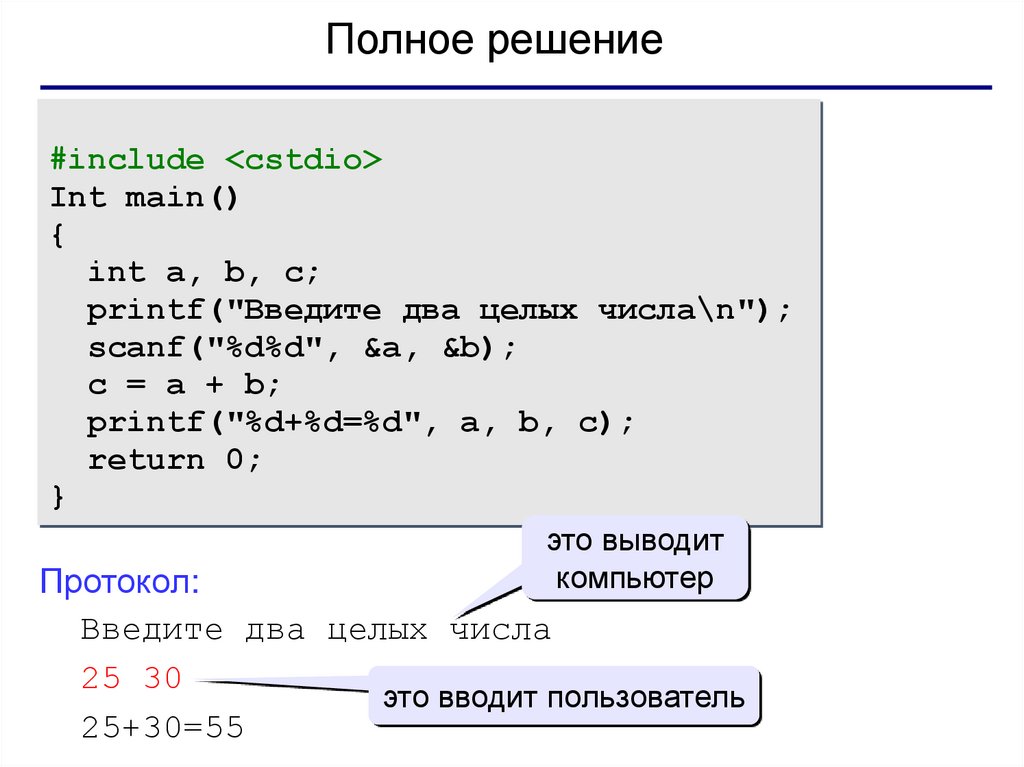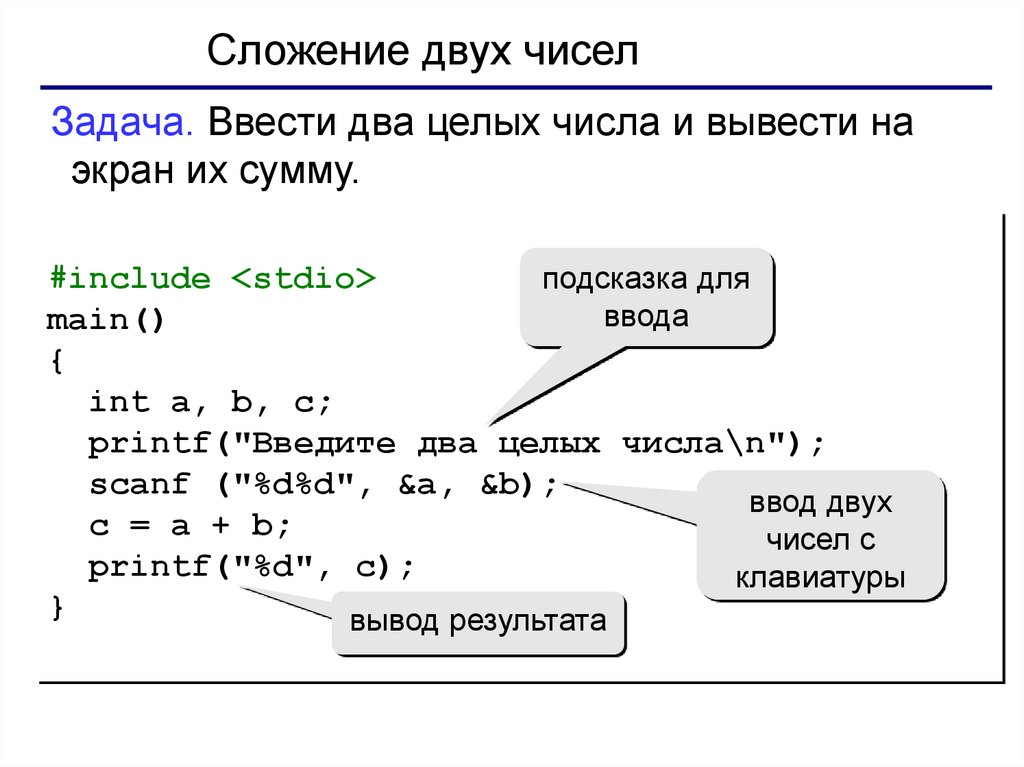 Сложение двух чиселЗадача. Ввести два целых числа и вывести на