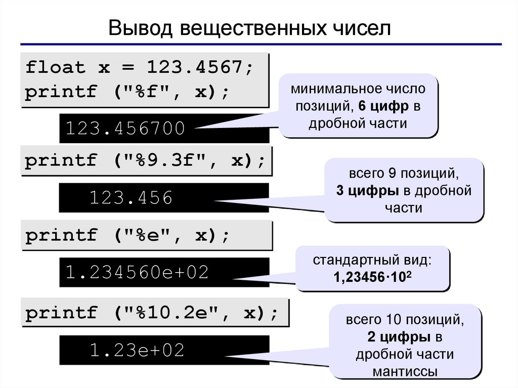 Вывод вещественных чиселfloat x = 123.4567;