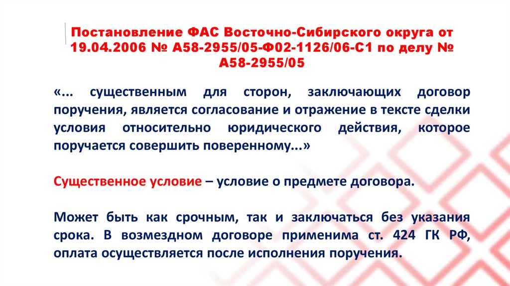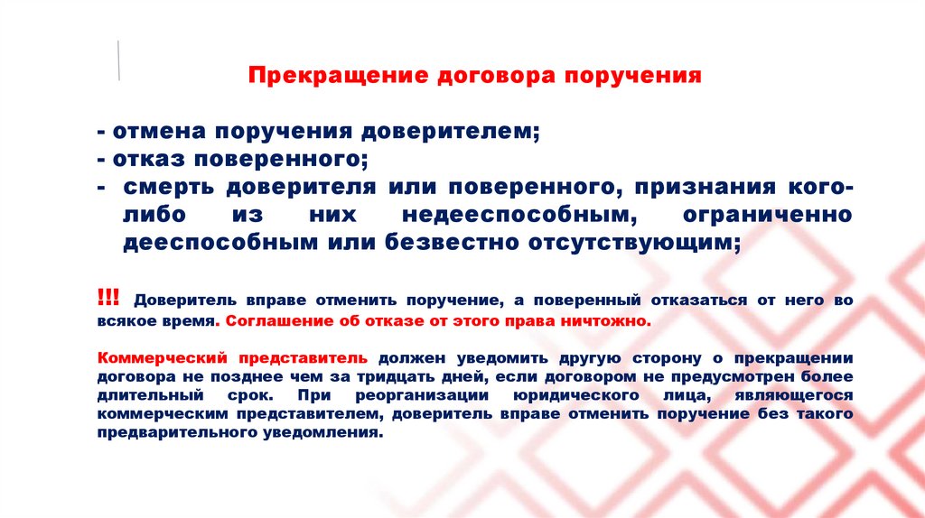ст. 972 ГК - поручение связано с осуществлением предпринимательской деятельности и др.)