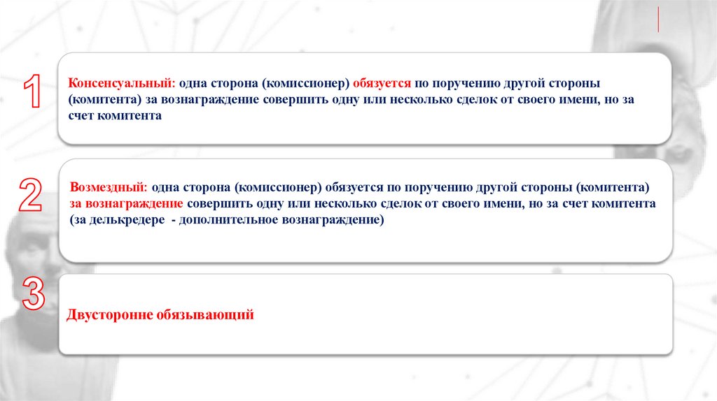 Консенсуальный: одна сторона (агент) обязуется за вознаграждение совершать по поручениюдругой стороны (принципала) юридические и иные действия от своего имени, но за счет