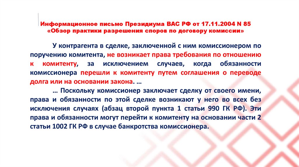ограничивающего такую уступку. Это не освобождает комиссионера от ответственности