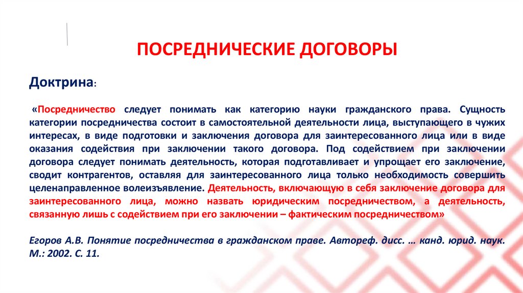 Егоров А.В. Понятие посредничества в гражданском праве. Автореф. дисс. … канд. юрид. наук.