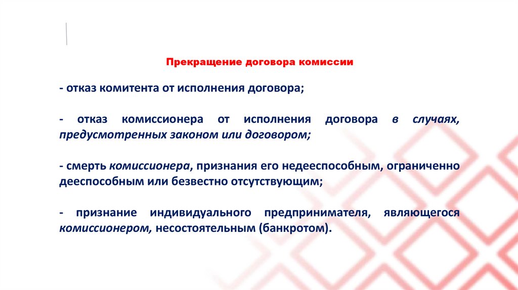 Прекращение договора комиссии- отказ комитента от исполнения договора;