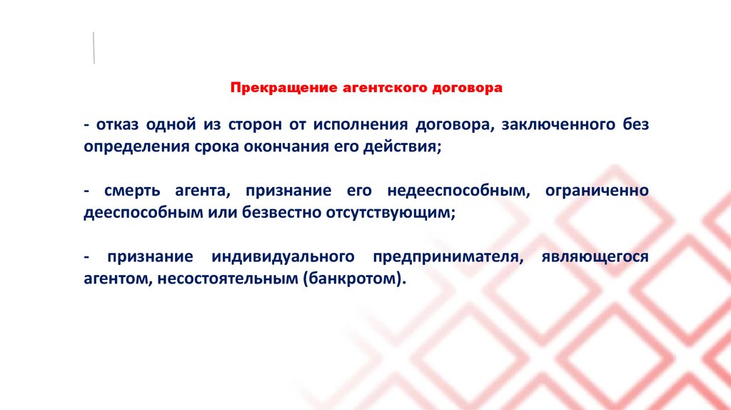 Прекращение агентского договора- отказ одной из сторон от исполнения договора, заключенного без