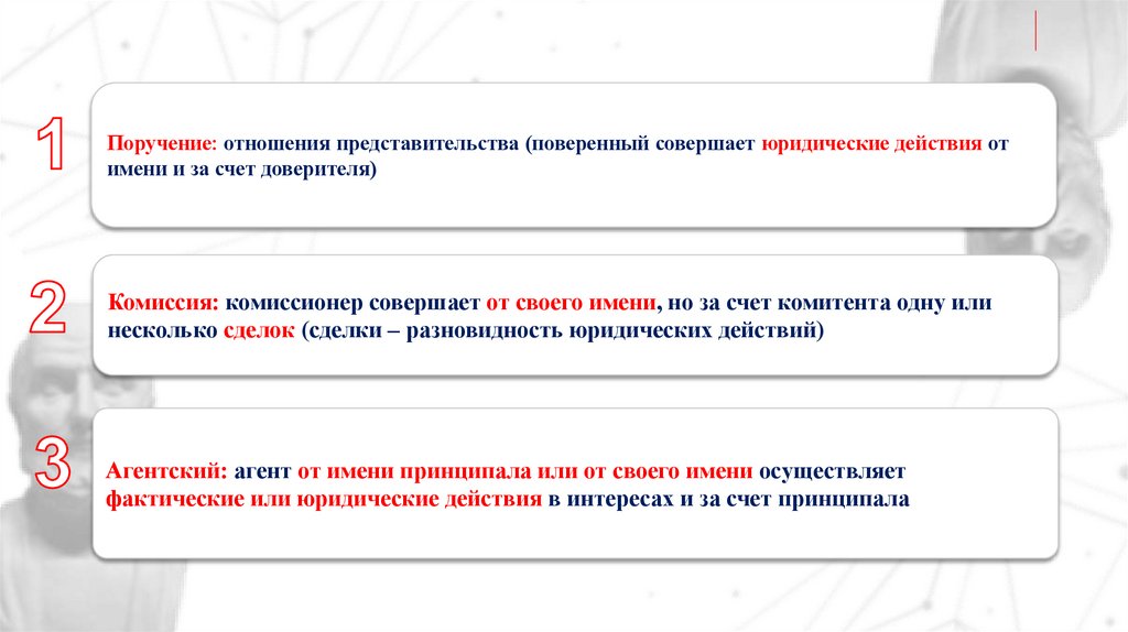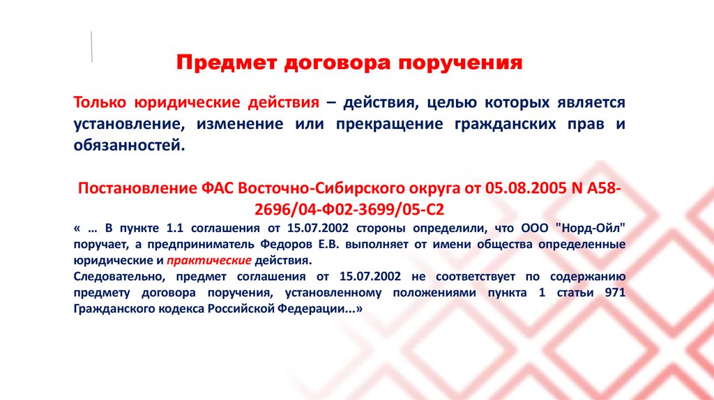 Предмет договора порученияТолько юридические действия – действия, целью которых является