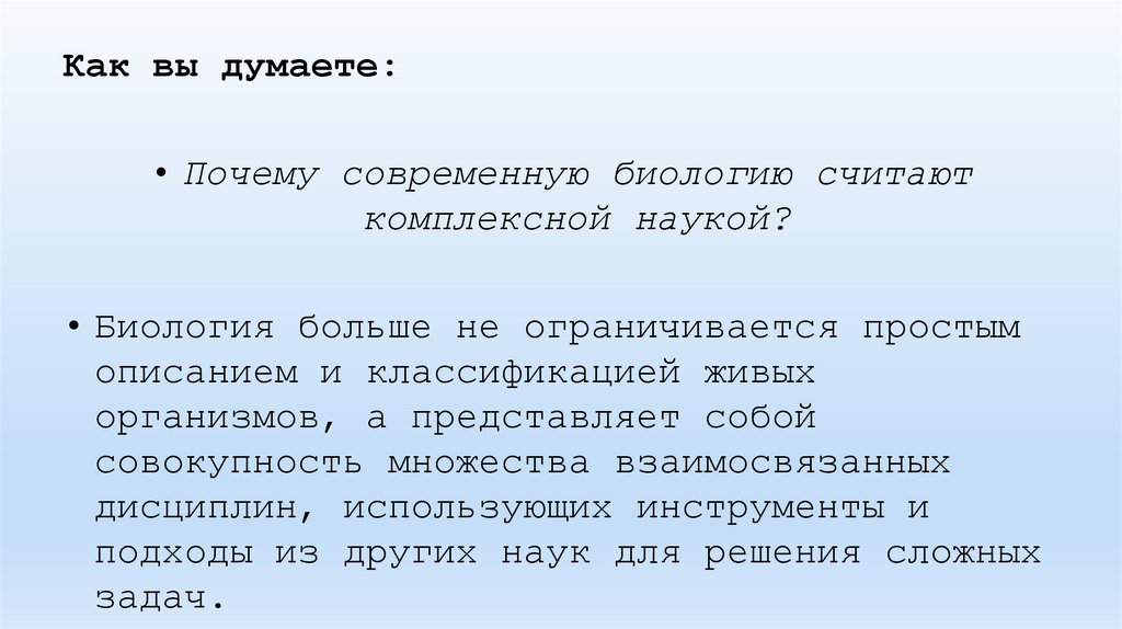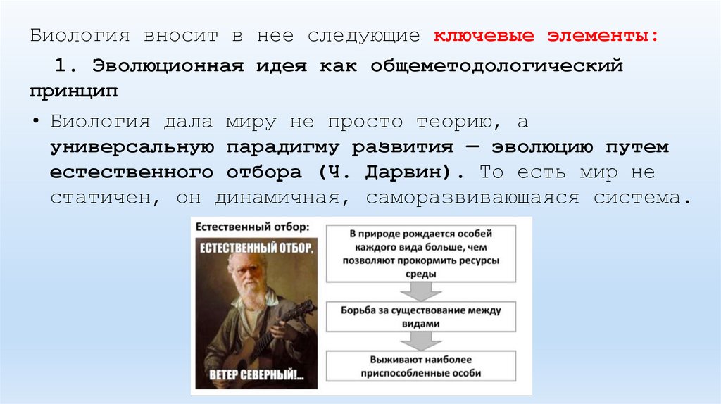 Биология вносит в нее следующие ключевые элементы:1. Эволюционная идея как общеметодологический