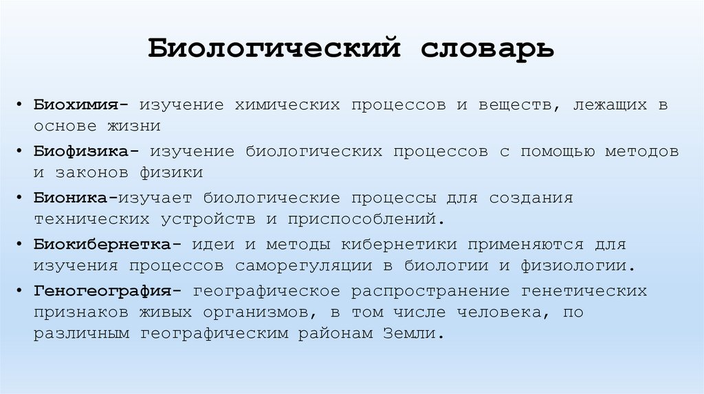 Биологический словарь• Биохимия- изучение химических процессов и веществ, лежащих в