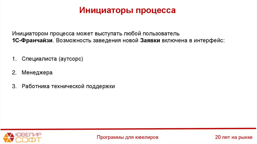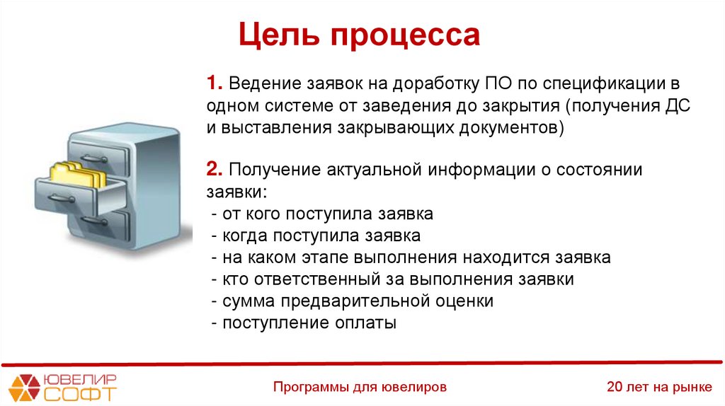 Цель процесса1. Ведение заявок на доработку ПО по спецификации в