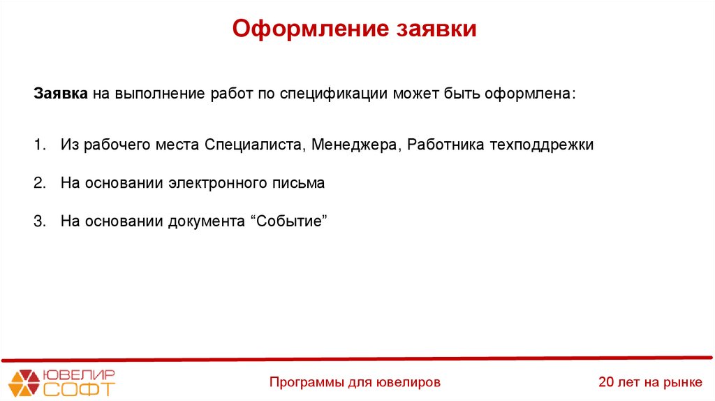 Оформление заявкиЗаявка на выполнение работ по спецификации может быть оформлена: