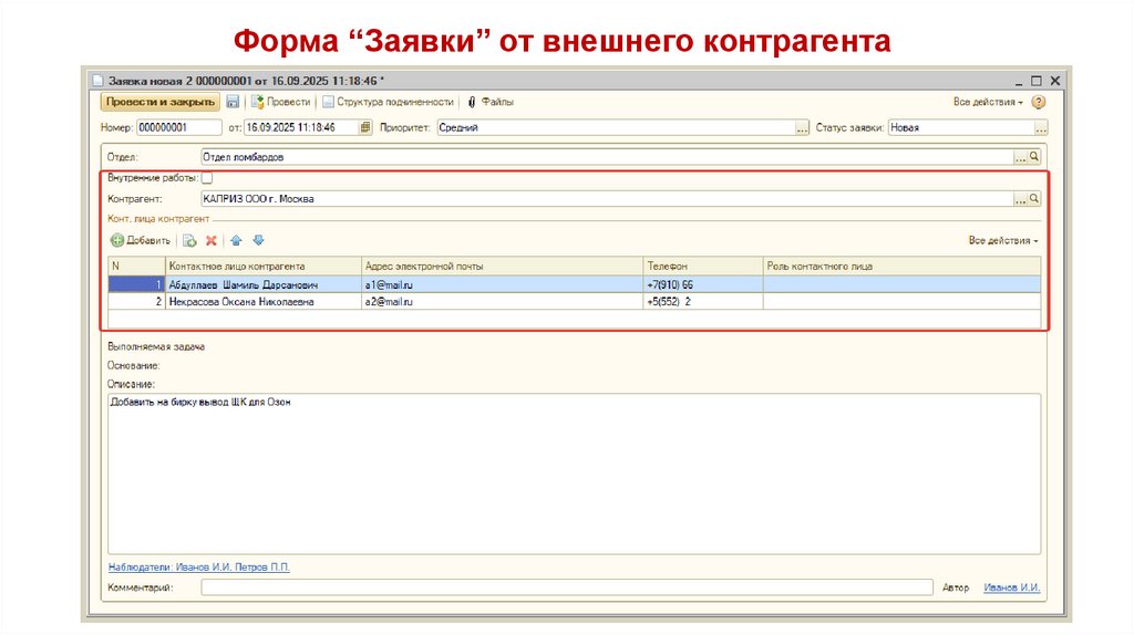 Форма “Заявки” от внешнего контрагента15.