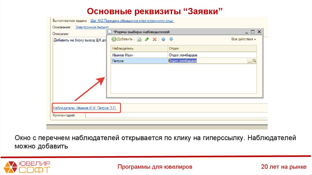 Основные реквизиты “Заявки”Окно с перечнем наблюдателей открывается по клику на гиперссылку. Наблюдателей