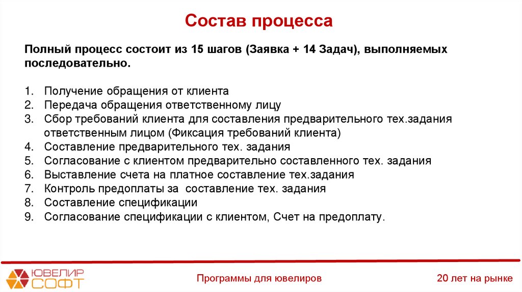 Состав процессаПолный процесс состоит из 15 шагов (Заявка + 14 Задач), выполняемых