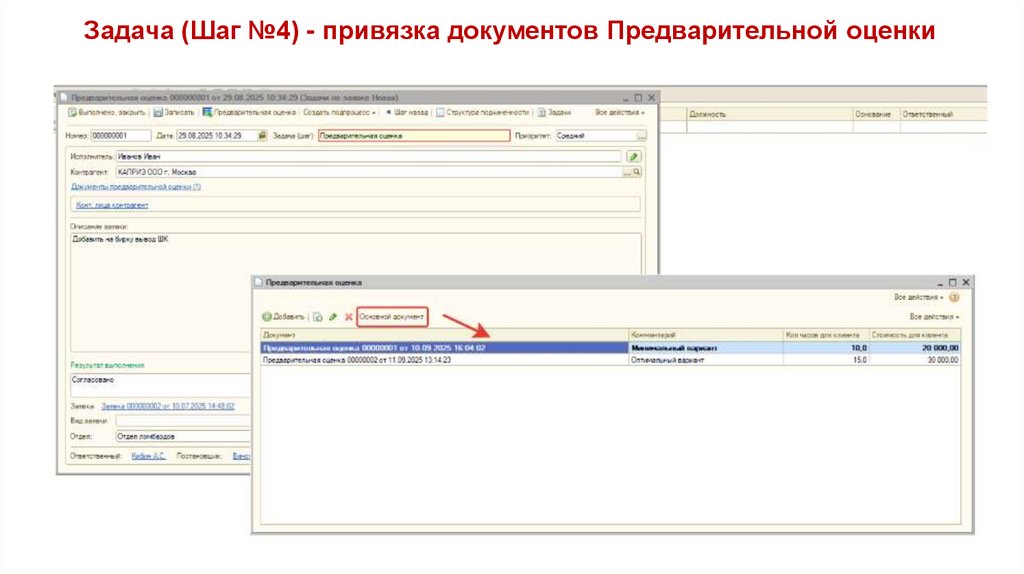 Задача (Шаг №4) - привязка документов Предварительной оценкиВыбранный основной вариант указывается гиперссылкой на форме Задачи