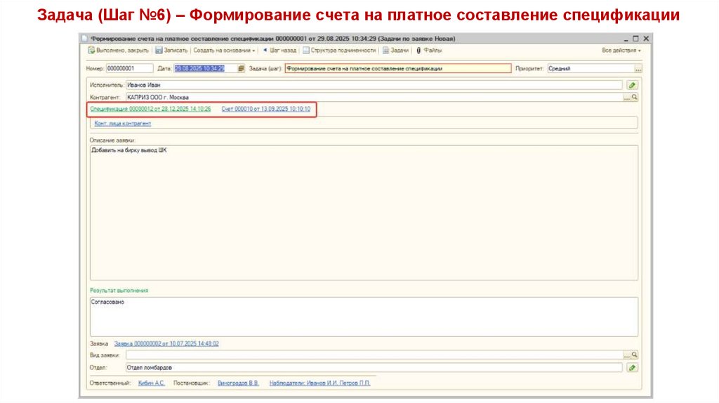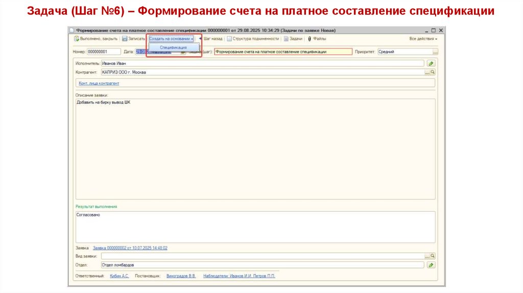 Задача (Шаг №6) – Формирование счета на платное составление спецификации40.