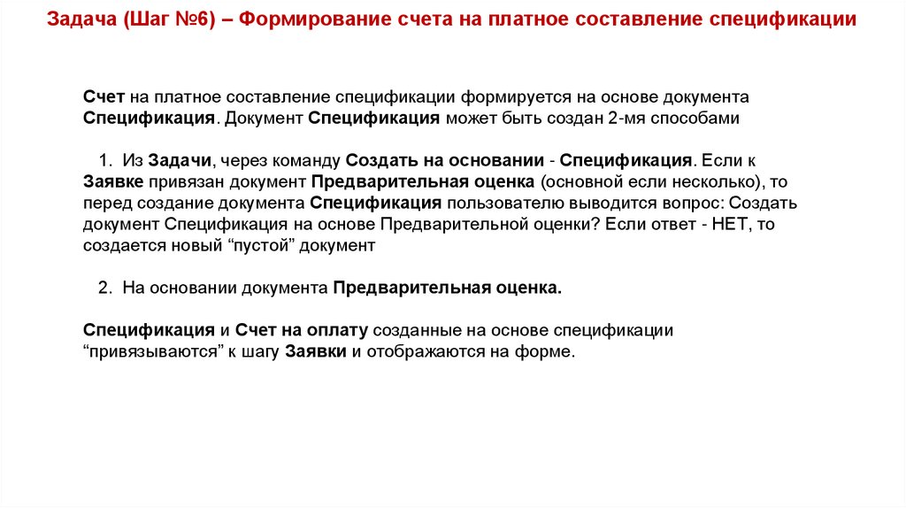 Задача (Шаг №6) – Формирование счета на платное составление спецификацииСчет на платное составление спецификации формируется на основе документа
