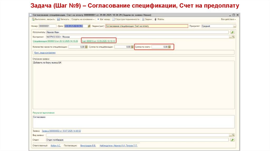 Задача (Шаг №9) – Согласование спецификации, Счет на предоплату45.