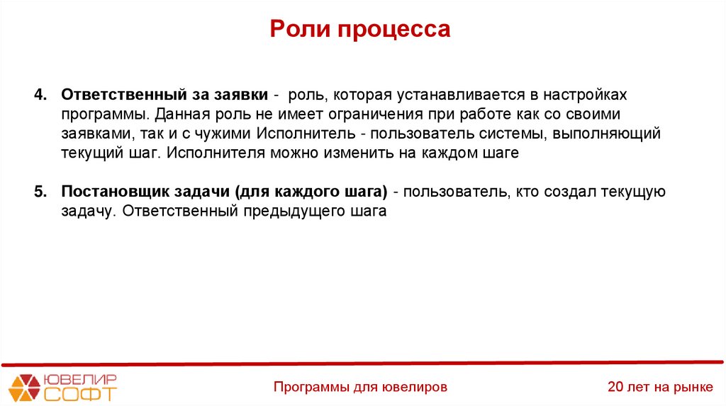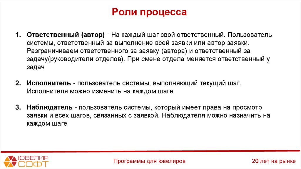 Роли процесса1. Ответственный (автор) - На каждый шаг свой ответственный. Пользователь