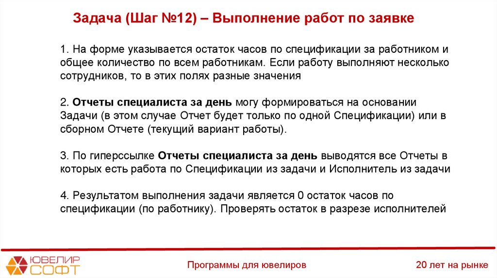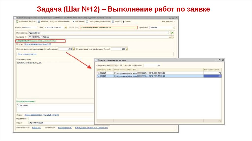 Задача (Шаг №12) – Выполнение работ по заявке1. На форме указывается остаток часов по спецификации за работником и