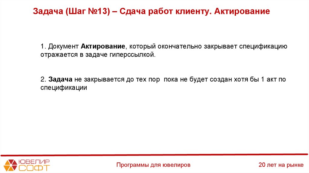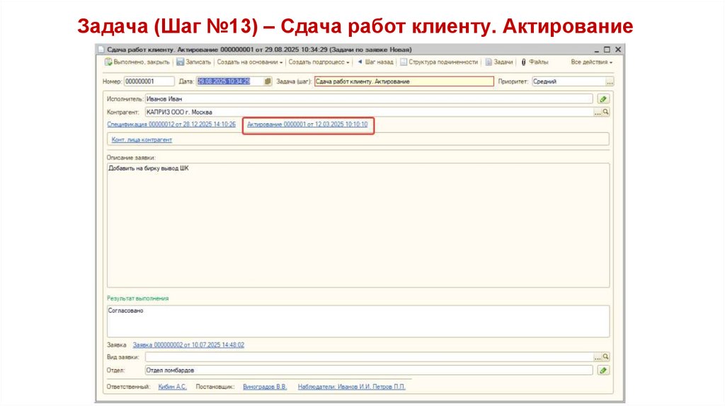 Задача (Шаг №13) – Сдача работ клиенту. Актирование1. Документ Актирование, который окончательно закрывает спецификацию