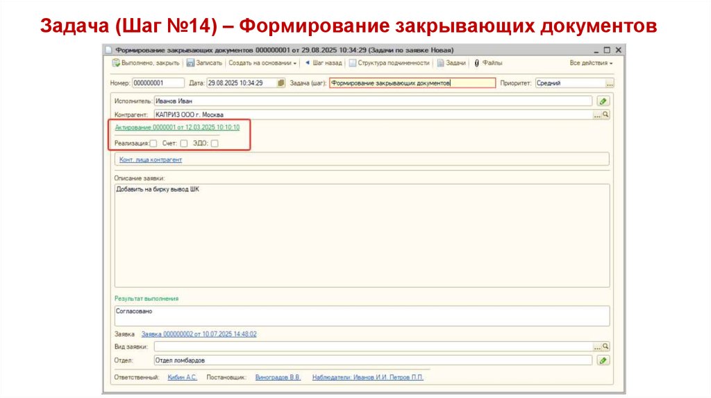 Задача (Шаг №14) – Формирование закрывающих документов56.