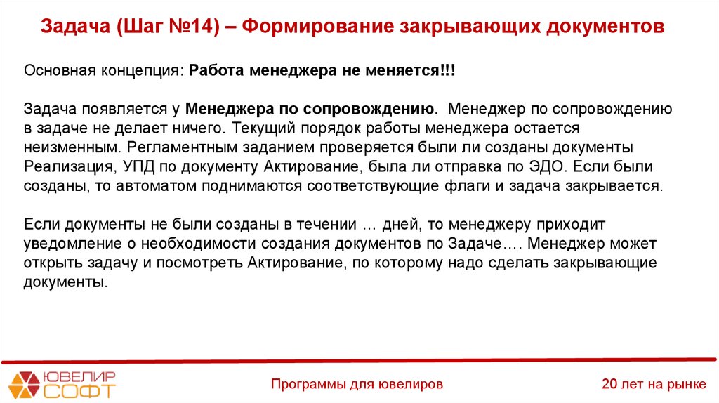 Задача (Шаг №14) – Формирование закрывающих документовОсновная концепция: Работа менеджера не меняется!!!