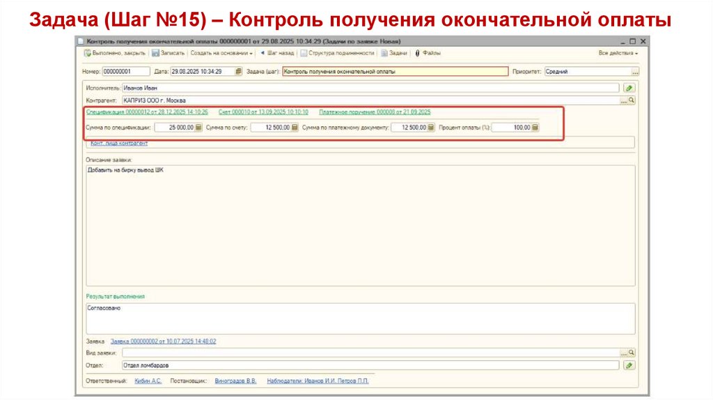 Задача (Шаг №15) – Контроль получения окончательной оплаты58.