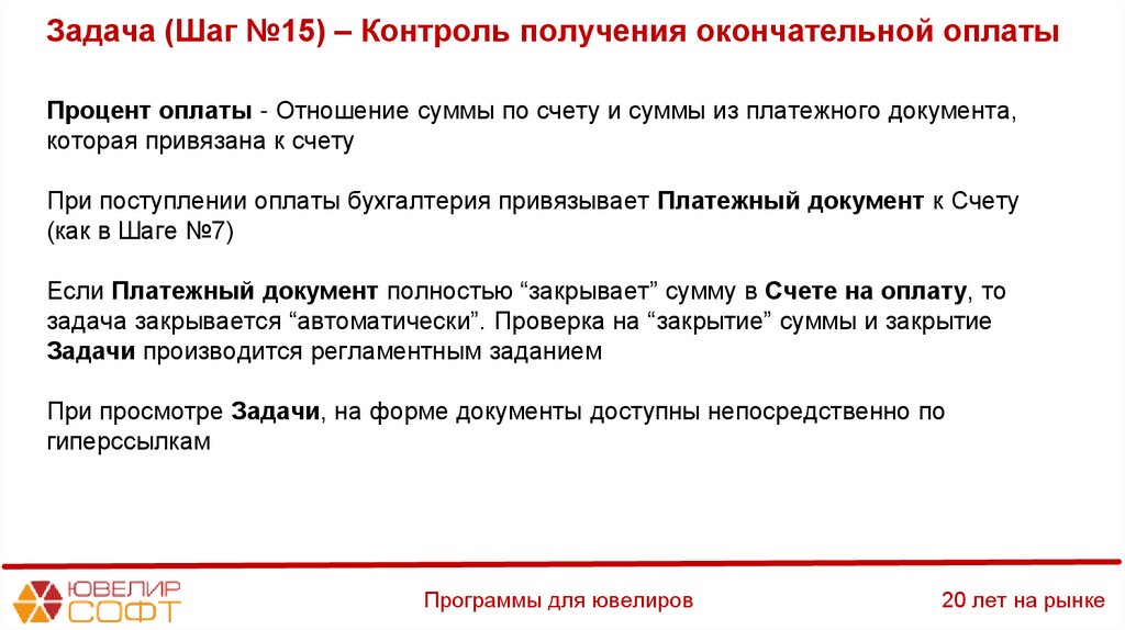 Задача (Шаг №15) – Контроль получения окончательной оплатыПроцент оплаты - Отношение суммы по счету и суммы из платежного документа,