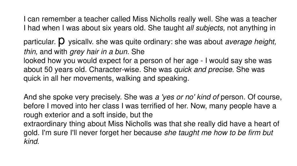 I can remember a teacher called Miss Nicholls really well. She was a teacherI had when I was about six years old. She taught all subjects, not anything in