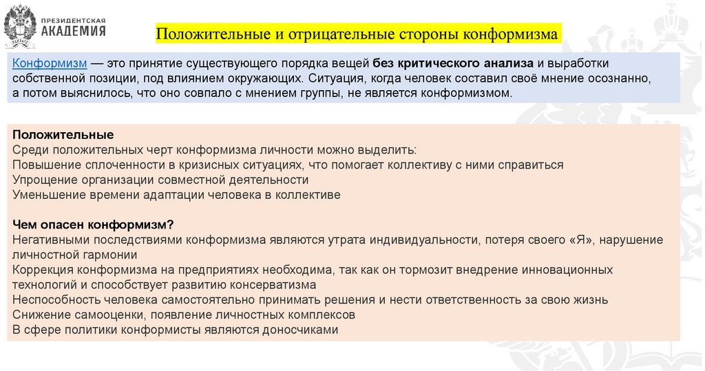 Положительные и отрицательные стороны конформизмаКонформизм — это принятие существующего порядка вещей без критического анализа и выработки