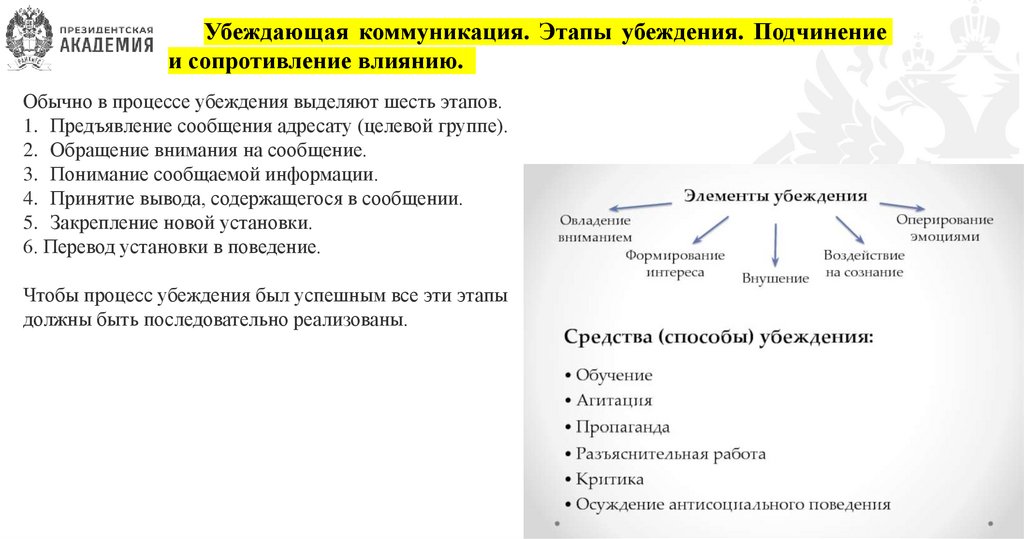 Убеждающая коммуникация. Этапы убеждения. Подчинениеи сопротивление влиянию.