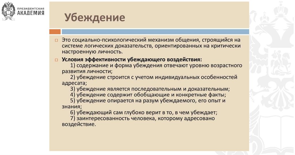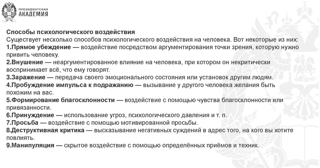 1.Прямое убеждение — воздействие посредством аргументирования точки зрения, которую нужно