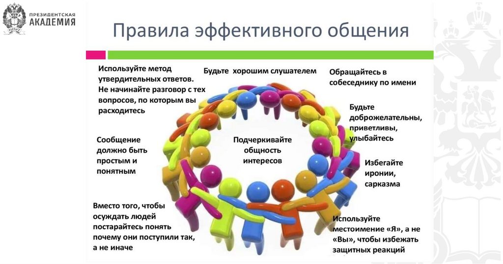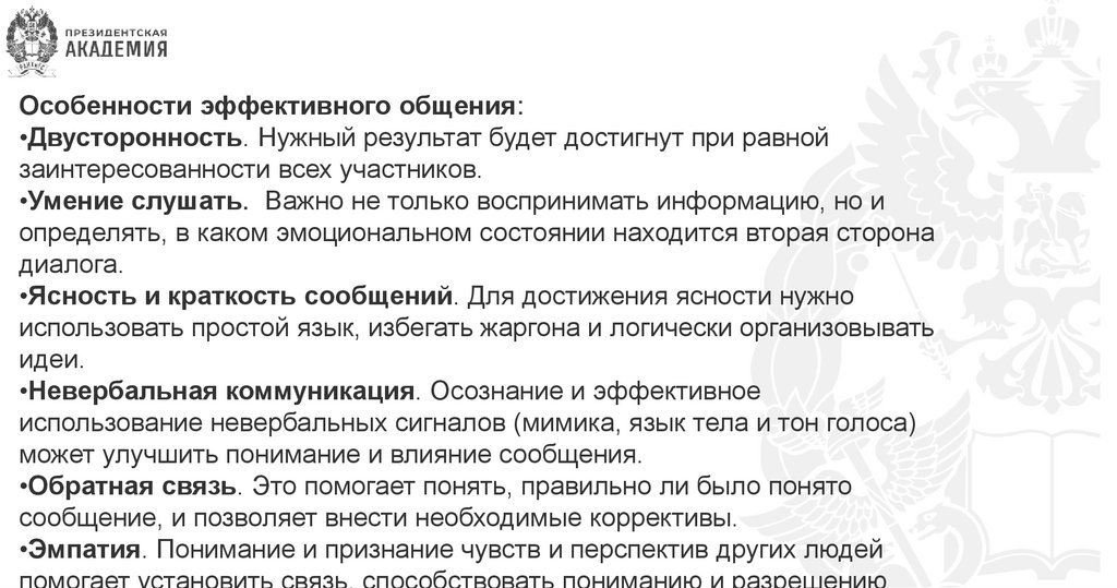 Особенности эффективного общения:•Двусторонность. Нужный результат будет достигнут при равной